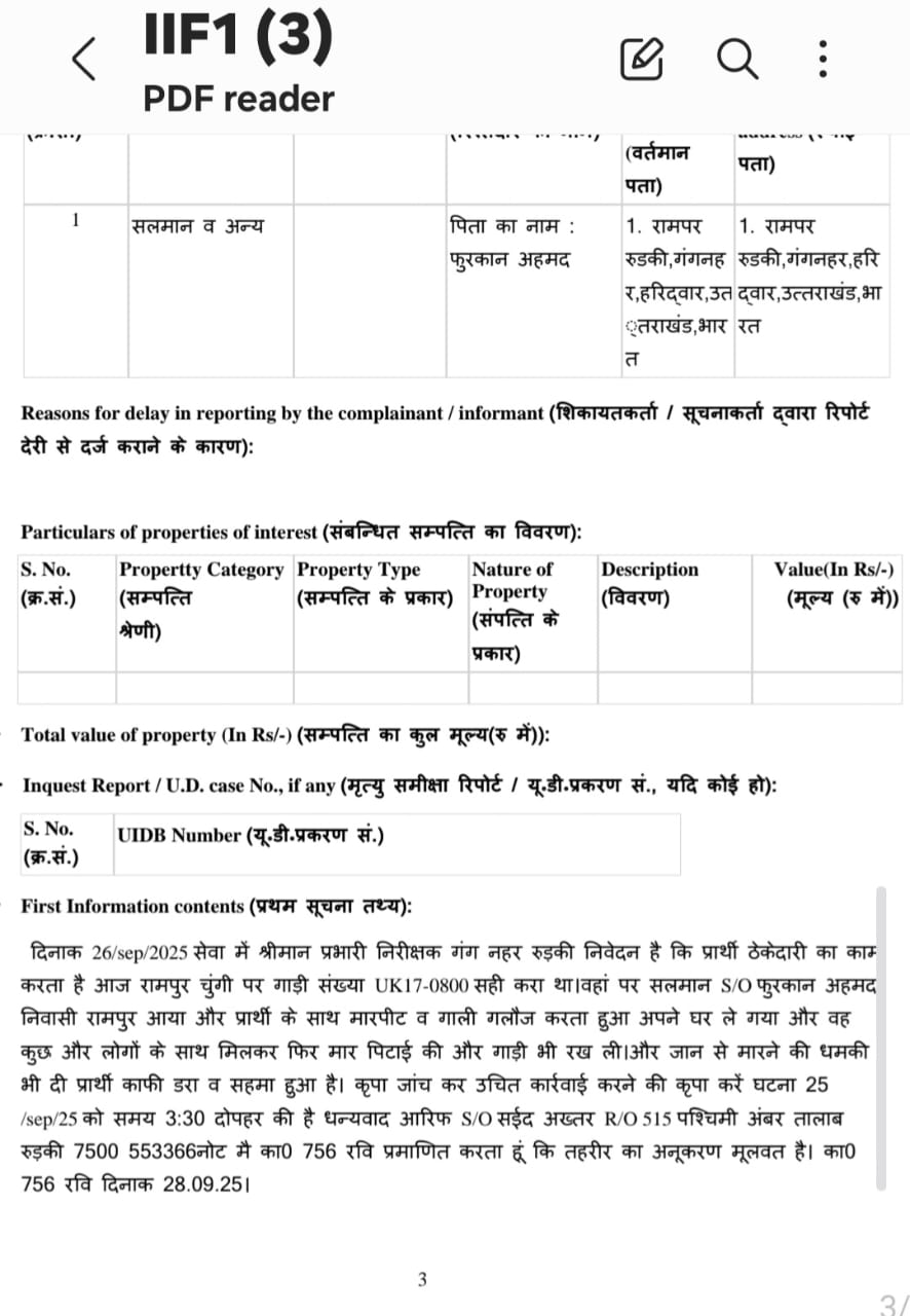 तहरीर देते हुए आरिफ निवाशी पश्चिमी अम्बर तालाब रुड़की ने बताया मै ठेकेदारी का कार्य करता हु। बताया कि मैं बीती 25 सितंबर को शाम के समय अपनी गाड़ी को ठीक कराने के लिए रामपुर चुंगी एक मैकेनिक के यहां आया था वहां पर पहुंचे सलमान पुत्र फुरकान अहमद ने मेरे साथ मारपीट और गाली गलौज शुरू कर दी।तथा गाली देते हुए मुझे अपने घर ले गया जहां पर उसके साथ अन्य आदमियों ने भी मेरे साथ मारपीट की तथा मेरी गाड़ी भी रख ली। पीड़ित ठेकेदार ने पुलिस को तहरीर देकर कानूनी कारवाई करने की मांग की हे। रुड़की की गंगनहर पुलिस ने पीड़ित ठेकेदार की तहरीर के आधार पर मुकदमा दर्ज कर जांच शुरू कर दी हे बताया जाता है कि पीड़ित ठेकेदार के दिल में दहशत पैदा हो गई है और वह अपने आपको डरा सहमा महसूस कर रहा हे।