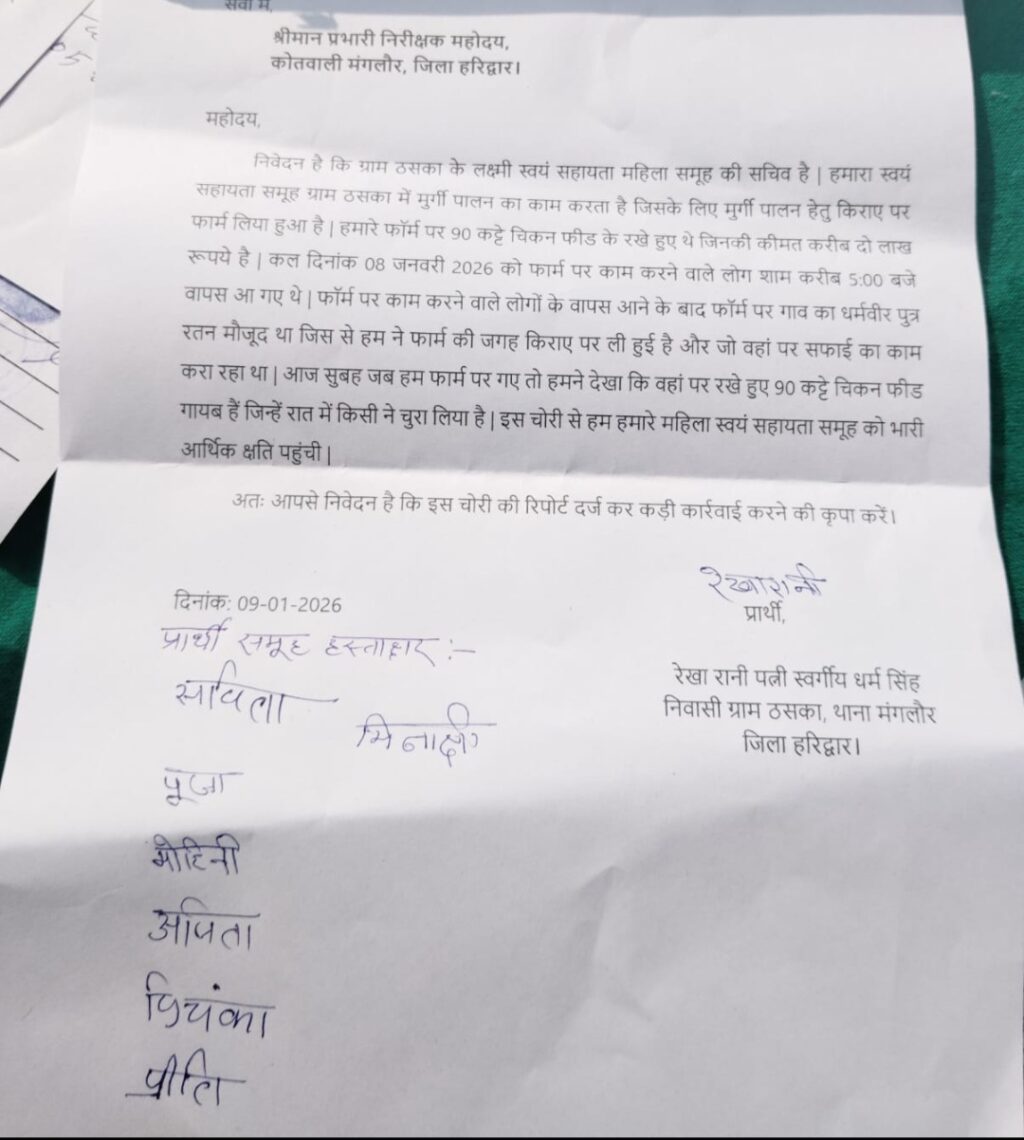 मंगलौर.. स्वयं सहायता समूह द्वारा खोले गए मुर्गी फार्म से करीब 90 कैट चिकन फीड मुर्गों की खुराक गायब मिली जिसे लेकर स्वयं सहायता समूह की सचिव रेखा ने अपनी टीम के साथ जाकर पुलिस को कट्टे चोरी होने की तहरीर दी। पुलिस ने आश्वासन दिया कि शीघ्र चिकन फीड के कट्टे चुराने वालों को गिरफ्तार कर न्यायालय में पेश किया जाएगा। तहरीर देते हुए लक्ष्मी स्वयं सहायता समूह की सचिन रेखा ने बताया कि हमने स्वयं सहायता समूह के द्वारा मुर्गी पालन के लिए ग्राम ठस्का में फार्म किराए पर लिया हुआ हे बताया कि हमारे फार्म पर चिकन फीड के 90 कट्टे रखे हुए थे जिनकी कीमत ₹2लाख रुपया है उन्होंने बताया कि बीते रोज मुर्गी पालन फार्म पर काम करने वाले लोग शाम 5:00 बजे अपने घर चले गए थे,