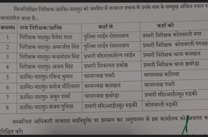 तहलका न्यूज़ वरिष्ठ पुलिस अधीक्षक हरिद्वार परमेंद्र सिंह डोभाल ने चार इंस्पेक्टर चार दरोगा के कार्यों में कार्यों में फेर...